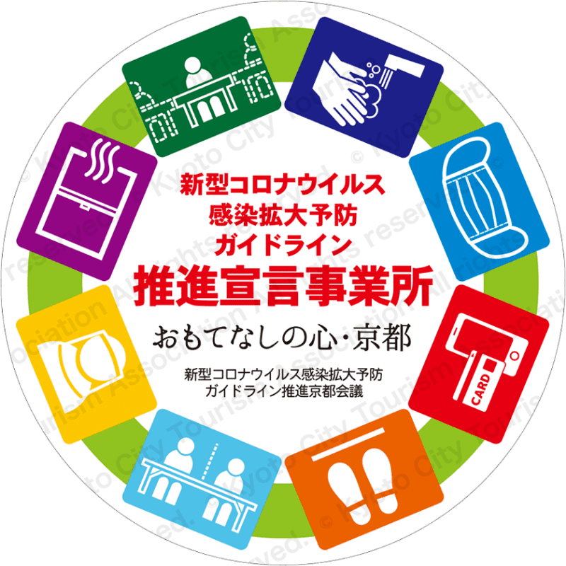 - 京都府の新型コロナウイルス感染拡大予防ガイドラインに基づく「新型コロナウィルス感染拡大予防ガイドライン推進宣言事業所」です。