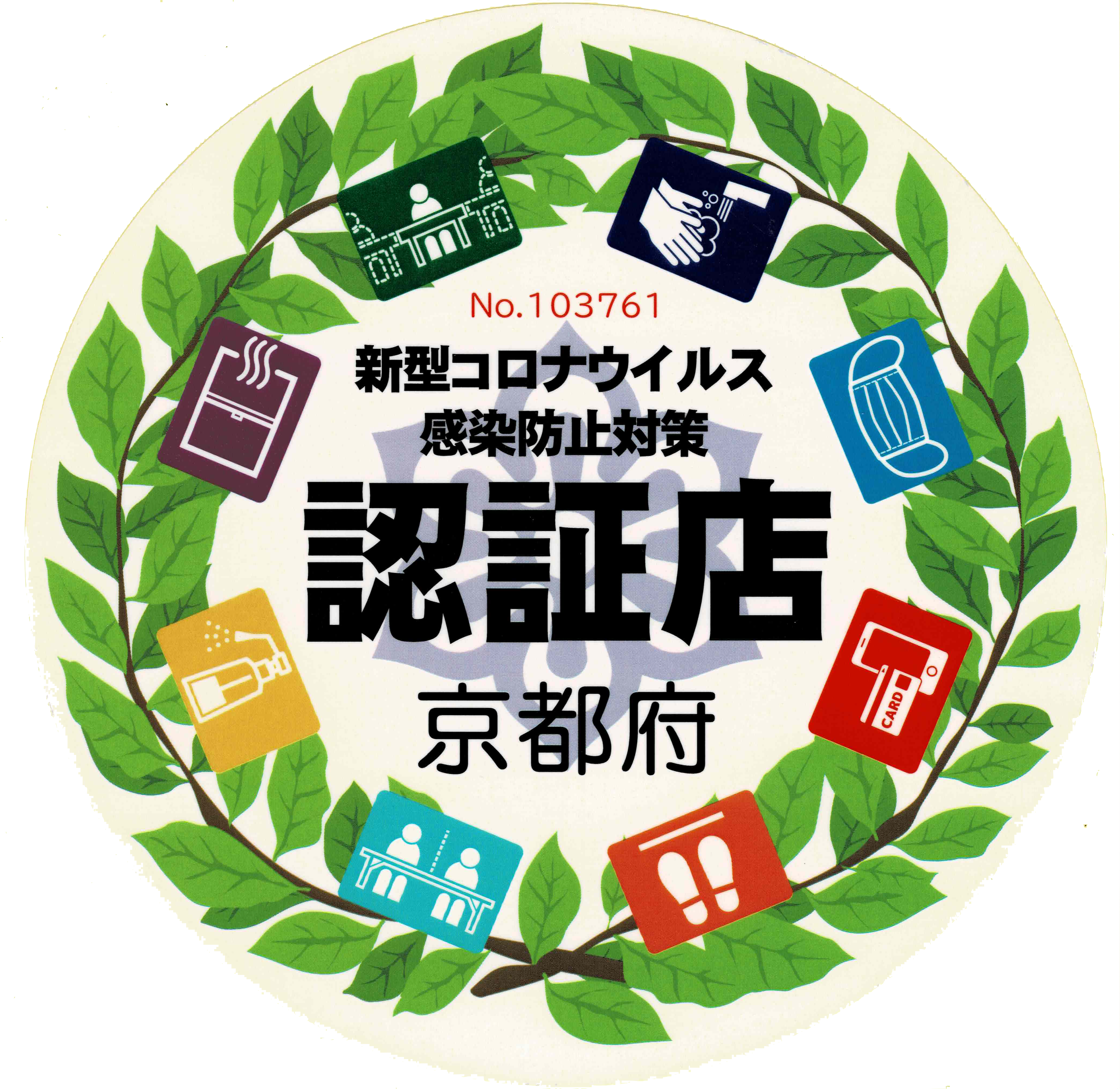 - 京都府が定めた基準に基づく感染防止対策が実施されている飲食店を認証する「京都府新型コロナウイルス感染防止対策認証制度」認証店です。