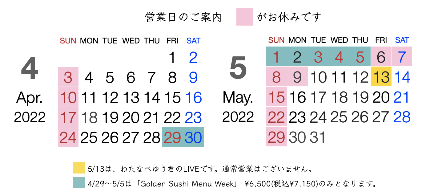 定休日:日曜日(GWなど祝日が連続する場合は変則的になります。